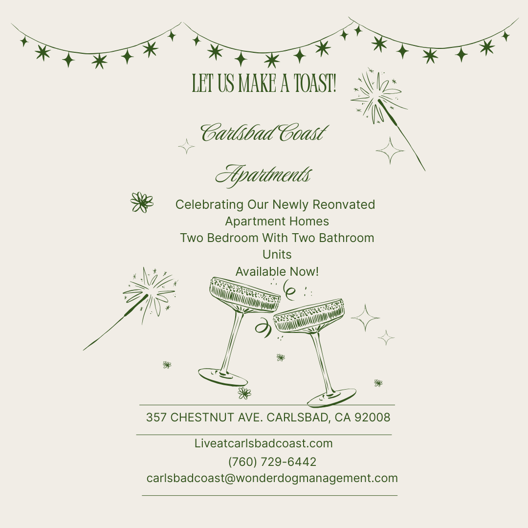 Contact: Call (760) 729-6442 or email carlsbadcoast@wonderdogmanagement.com to schedule viewings, visit liveatcarlsbadcoast.com to apply and view all available units
